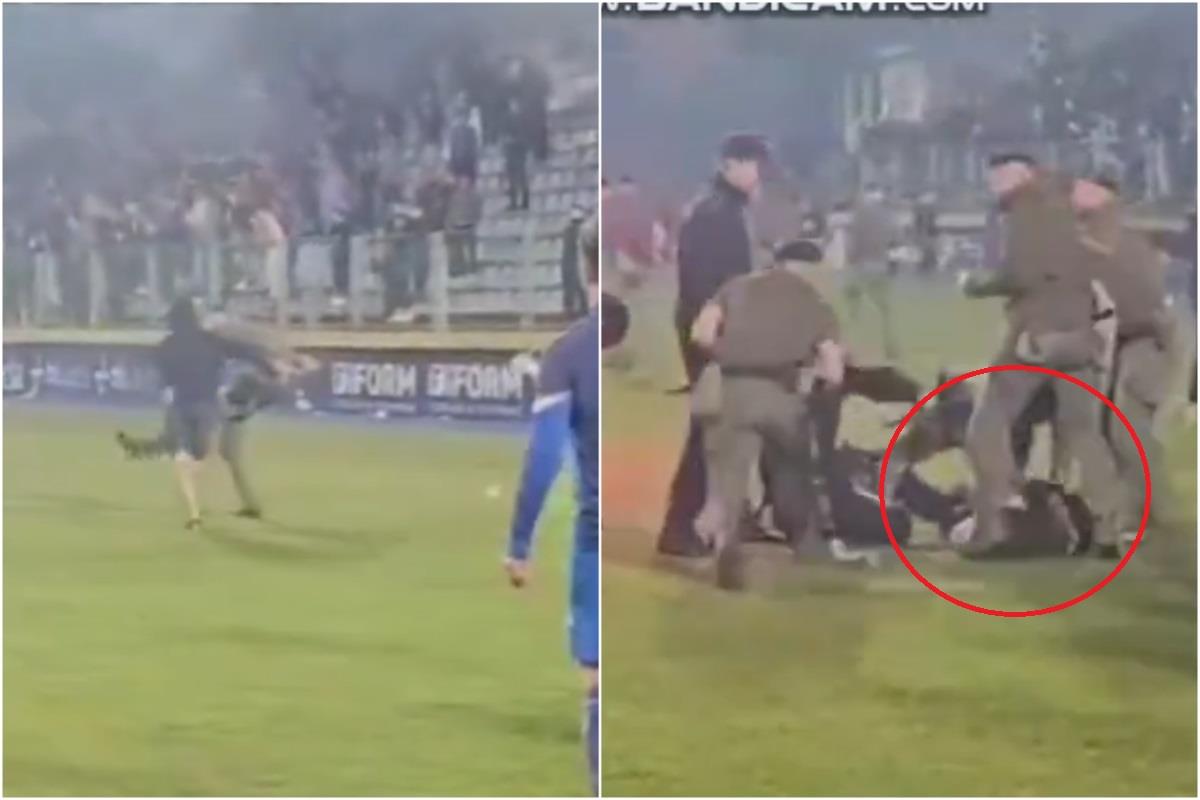 Prisutni policajci su uspeli da ga obore pre nego što je došao do njih, a navijač je usput dobio i ozbiljne batine.