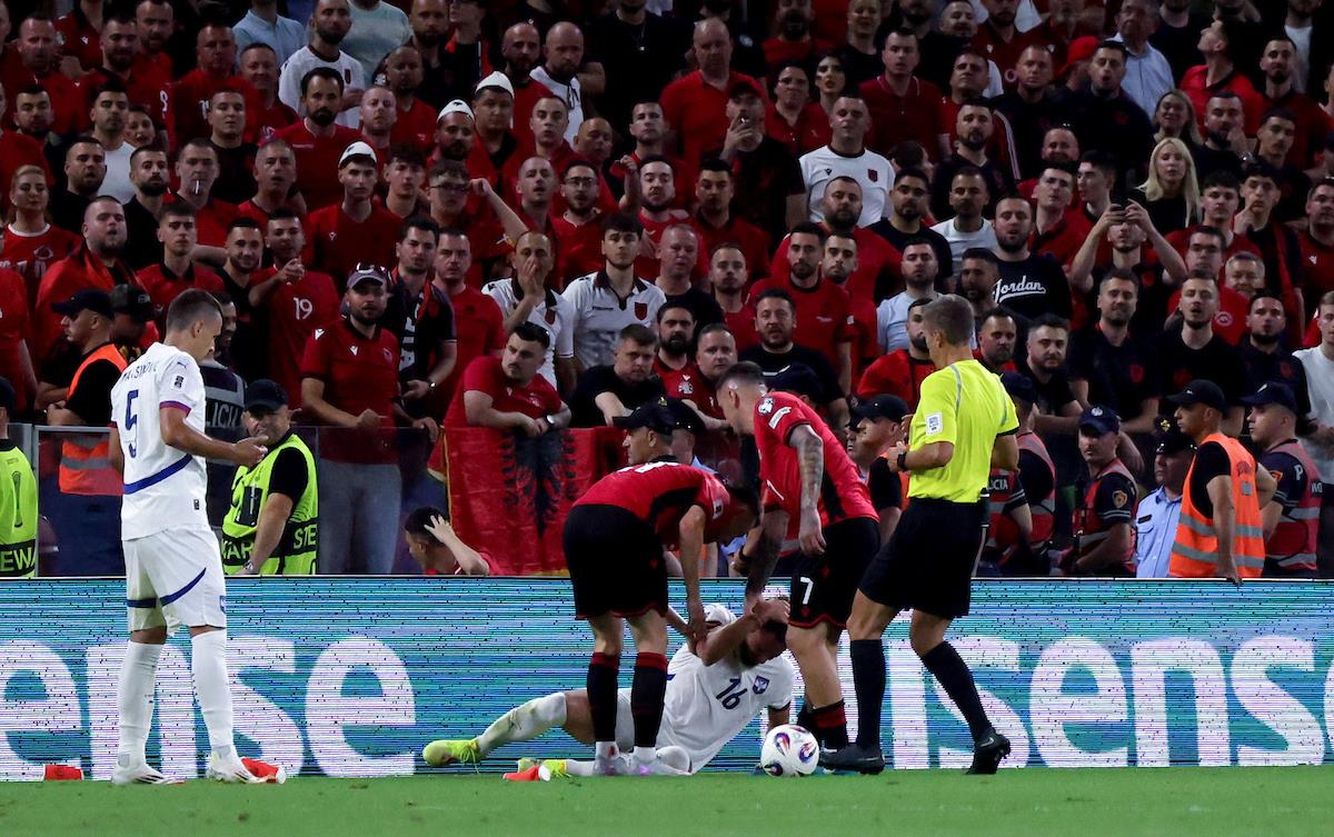 Meč je obeležilo jezivo ponašanje albanskih huligana koji su pet puta prekidali duel tako što su POGODILI fudbalere Srbije predmetima u glavu.