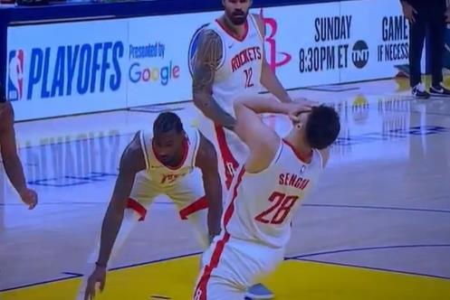 Nakon jednog duela sa Stefom Karijem, Šengun je odglumeo da je dobio udarac u glavu od američkog superstara.
