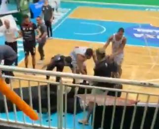 Usledile su jezive scene, pošto je nesrećni sudija šutiran od strane više lica dok je ležao na parketu, a drugi arbitri su uskočili kako bi zaustavili ovaj nezamapćeni skandal.
